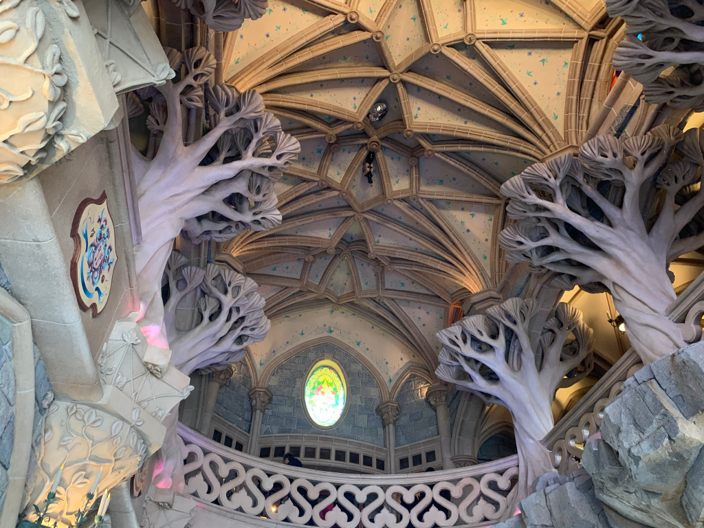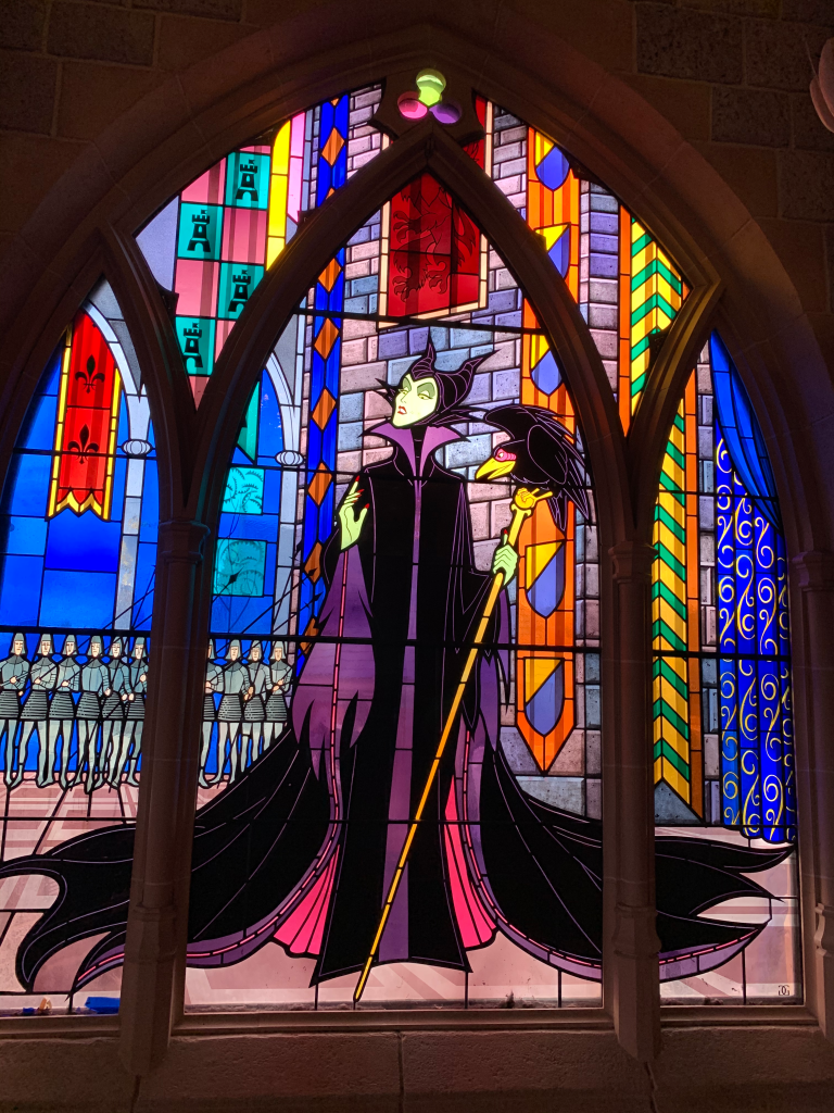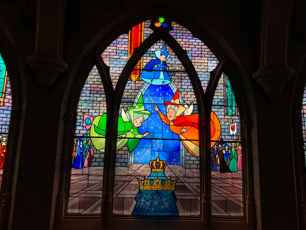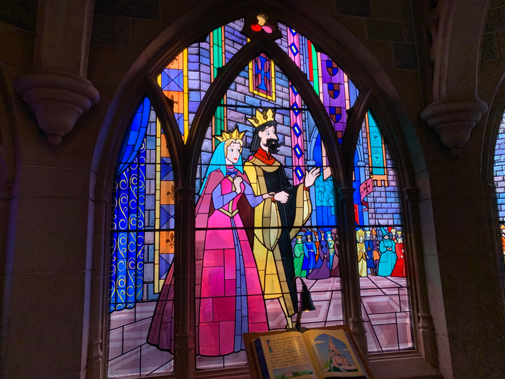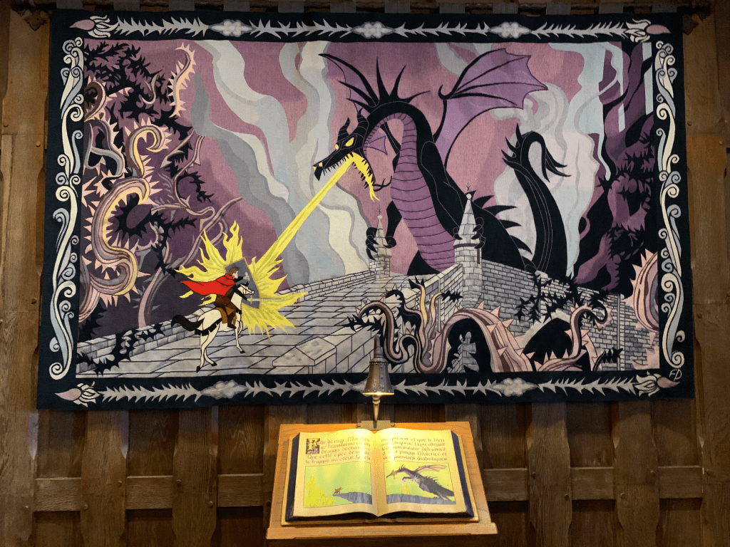 Sleeping Beauty’s castle is unique in the ability to explore the interior balcony on the second floor, which is filled with gorgeous stained glass scenes of Sleeping Beauty, animated tapestries with a corresponding storybook, and the ability to step out onto the back exterior balcony and look out at Fantasyland. There is also a dungeon below the castle that holds a dragon, go and see him yourself, just look for the sign in the gallery below for the entrance. The castle also twinkles at night during its shows, just as the Eiffel Tower does, paying a beautiful homage to the City of Lights.